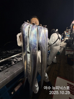 #여수뉴피닉스호ㅡ11월23일갈치조황오랫만에 기상좋은 주말을 맞아 배들이 너무많네요오늘은 기본조황하고 다녀왔습니다.많이 잡으신분은 쿨러 채우시고 가시고먹을만치 잡으신분도 계십니다.함께해주신분들 모두 오랜시간 수고많으셨습니다.기상이 허락해야만 나갈수 있는 먼바다 갈치출조는12월까지 계속합니다.▶️ 갈 / 치 / 출 / 조24일(월) 기상악화휴항25일(화) 기상악화휴항26일(수) 자리여유27일(목) 점 검28일(금) 자리여유29일(토) 자리여유30일(일) 자리여유예약문의 ☎️ 010 7178 3800☞☞☞ 새해 2026年(병오년) ☞☞☞뉴피닉스호 여수 물때달력이 나왔습니다.사무실에서 받아가십시요. ====== 여수 피닉스피싱 예약안내 =======여수권 최고의 포인트로 안내하겠습니다. ■ 예약문의 :☎ 010-7178-3800■ 사무실 오시는길:여수시 신월1길7-3 피닉스피싱■ 홈페이지 바로가기: http://np.sunsang24.com/ ■ 출항지:여수시 신월1길31(신월동 CU편의점 방파제)■ 밴드 바로가기 :https://band.us/band/71220382 ■ 계좌안내 : 수협 / 2060-0078-1794 / 조영호 서울,경기<ㅡ>여수간 에이스 출조버스운행안내ACE출조버스: 02-2665-2326, (010-3236-2329) #여수뉴피닉스호 #왕갈치 #대포한치 #거문도 #백도#간여 #점주조황 #여수조황 #남해조황 #갈치 #한치#한치이카메탈 #한치오모리 #문어 #갑오징어 #쭈꾸미